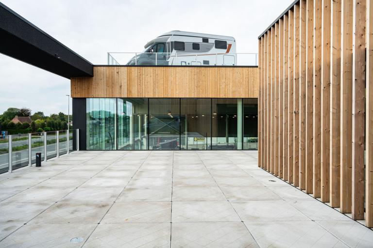 De nieuwe Vanomobil showroom in Lokeren is veel meer dan een plek om motorhomes te presenteren. De bouw ervan past in de strategie van het bedrijf om het aantal verkooppunten in Vlaanderen uit te breiden en helpt de visie van het bedrijf uit te dragen om dichter bij de klant te staan. “Reizen met de motorhome is aan het democratiseren”, vertelt Ignace Coudron, CEO van Vanomobil. “We wilden een showroom die functioneel is en een fijne, uitnodigende omgeving creëert voor medewerkers en klanten. Iedereen moet er zich welkom voelen.” De nieuwe toonzaal vinkt al die vakjes moeiteloos af.